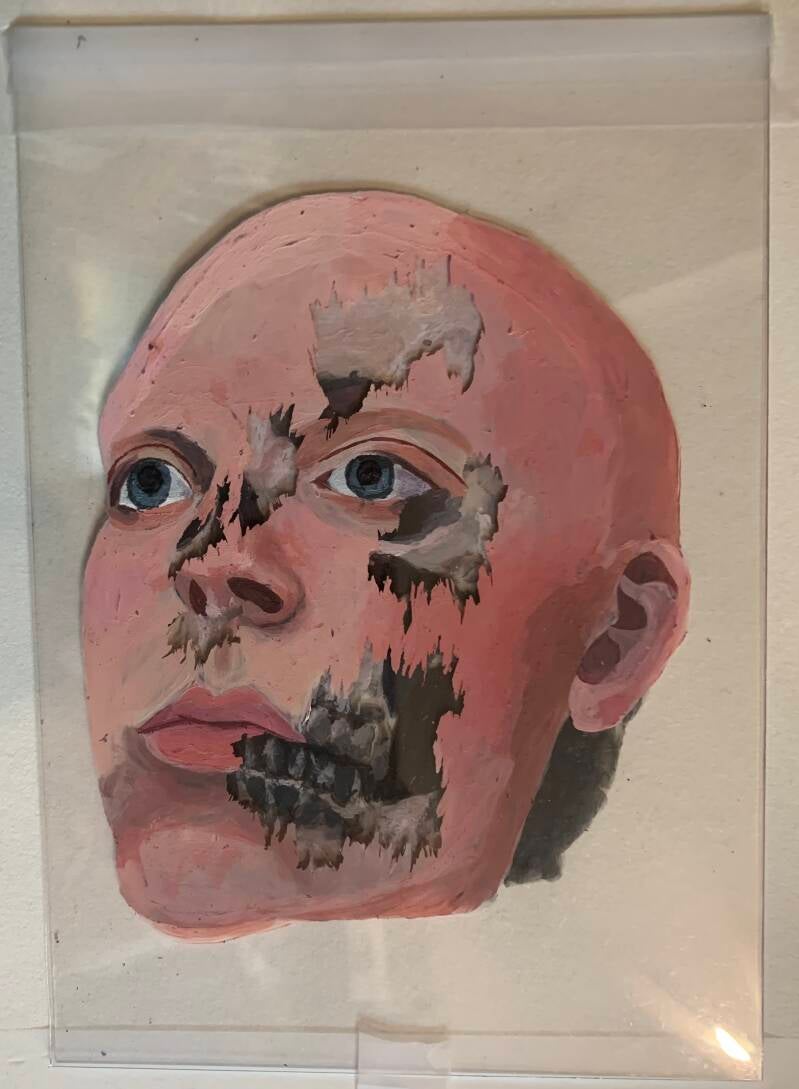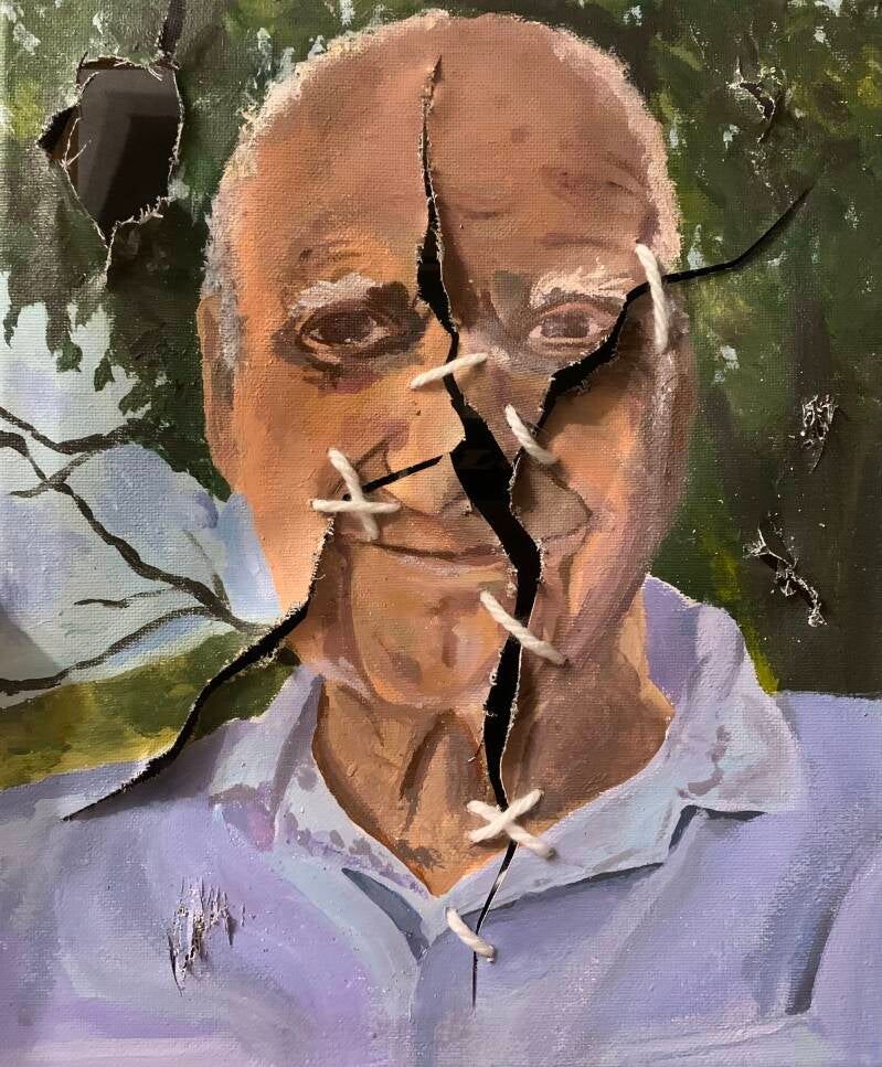 This portrait of my grandad I cut up and messily stitched back together to represent the decaying mind. I painted the back of the canvas black to emphasise the fold and cuts.