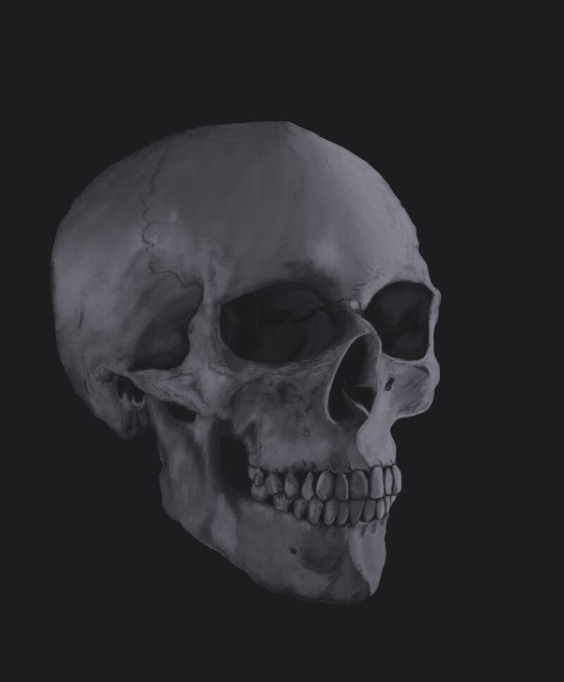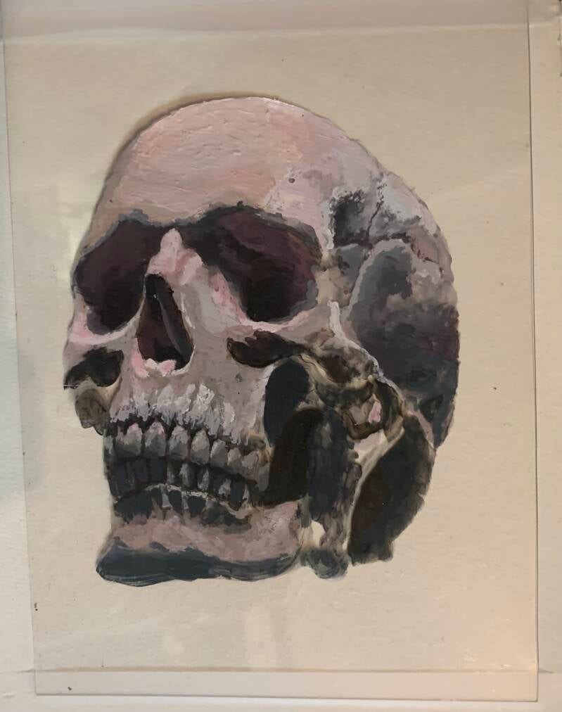 A two part piece: on one layer of plasticine is the skull, and on the other is the face. When they overlap each other, the scratched away paint reveals the skull underneath