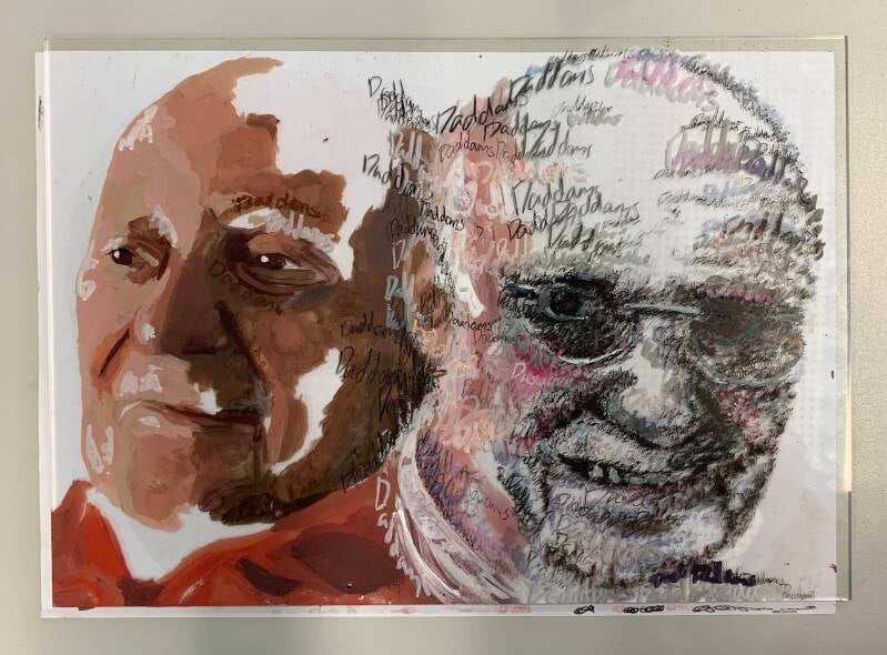 This was painted on three layers of persepex: one layer says 'Derek', one says 'Daddams' and the final one is a portrait which encorporates letters into the painting.