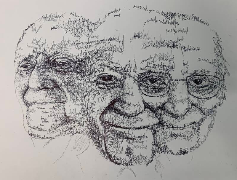 These three faces are drawn using the three names we had for my grandad: Derek, Daddams, and Grandad.