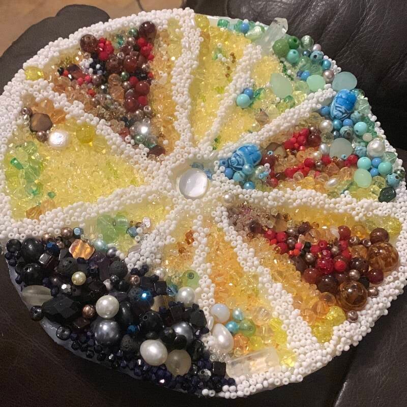 This textile piece is inspired by the loss of self that comes from dementia. I painted onto a piece of fabric and cut it up into segments. Then, I messily stitched the pieces back together with embroidery thread, joining the pieces together slightly askew.