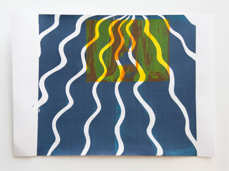 These were made with two different processes of printmaking, stencilling and a printing press. I made the blue background by cutting out the shapes on a piece of paper, whatever was cut out would get painted by the ink. For the image part, I experimented with mixing the ink colours to get a marbling effect when I used the printing press.